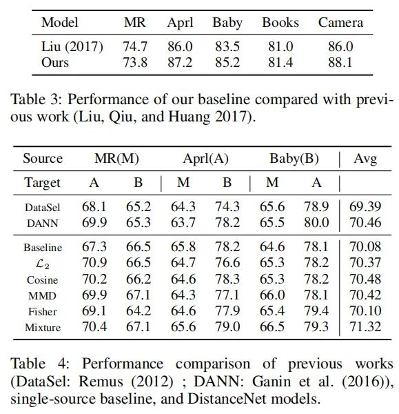 表 4 显示了当源域和目标域不同时 Baseline Model 和 DistanceNet 的结果,其中最后一列显示平均结果。与表 3 中的数字进行比较,可以看到,当数据分布发生变化时,性能会下降。