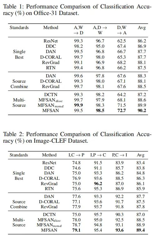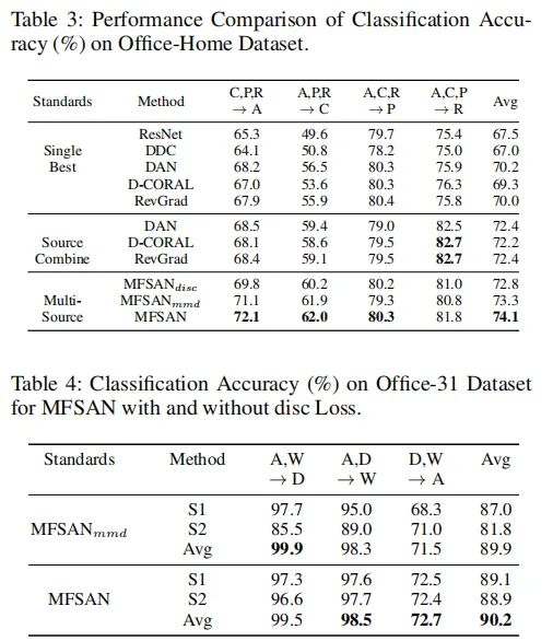 论文将 MFSAN 与三个基准数据集进行比较,结果分别如表 1、表 2 和表 3 所示。论文还比较了 Office-31 数据集上没有 disc 损失的 MFSAN,并在表 4 中列出了来自不同源域的分类器的结果。