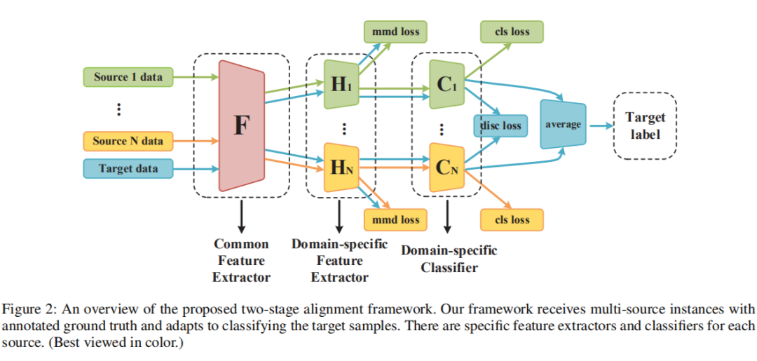 靠近类边界的目标样本容易被误分类,为此,论文提出了一个多特征空间适应网络(简称 MFSAN)。框架由一个共同特征提取器、N 个源域特定的特征提取器和 N 个源域特定的分类器组成。