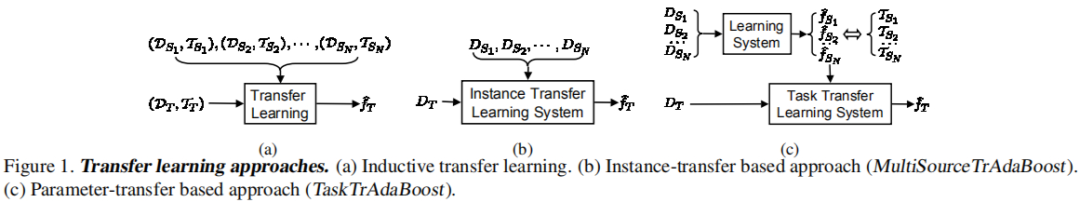 图1(b)与图1(c)表示两种算法的概念图。MultiSource-TrAdaBoost 标识出来自不同源域的哪些训练实例可以与目标训练实例一起重用,以增强目标分类器。TaskTrAdaBoost 使用参数传递方法,提取出构成源任务分类器 模型的参数。