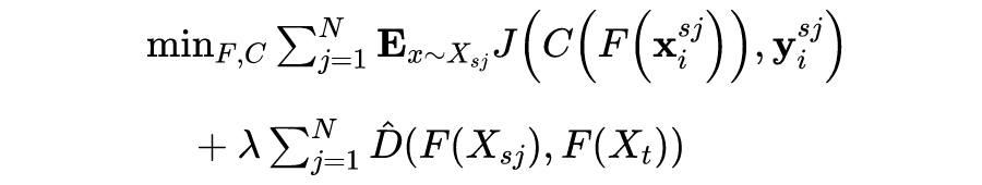 模型框架如左上图所示,在分类损失的基础上增加域距离项来形成模型的损失函数,损失函数与单个源域的损失函数类似: