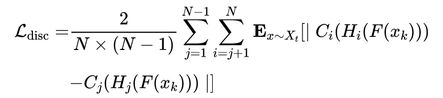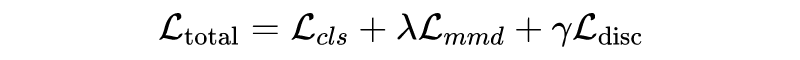 总的来说,损失由三部分组成,分类损失,MMD 损失,disc 损失。通过最小化分类损失,网络可以对源域数据进行准确分类;通过最小化 mmd 损失来学习领域不变表示;通过最小化 disc 损失来减少分类器之间的差异。总损失用公式表示: