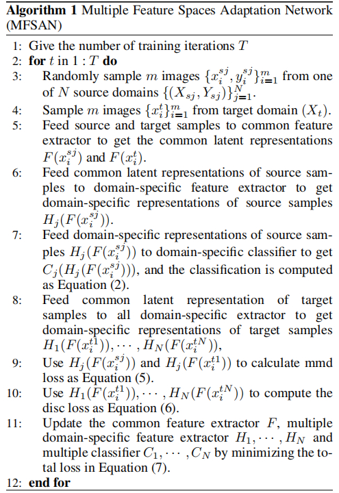 这是一篇将多源迁移学习和领域自适应结合起来的论文,论文的框架结构非常清晰明了。基于深度学习的多源无监督域自适应(MUDA)算法主要通过在一个公共特征空间中对齐源和目标域对的分布来提取所有域的共同域不变表示,同一空间的域特征损失函数如下所示: