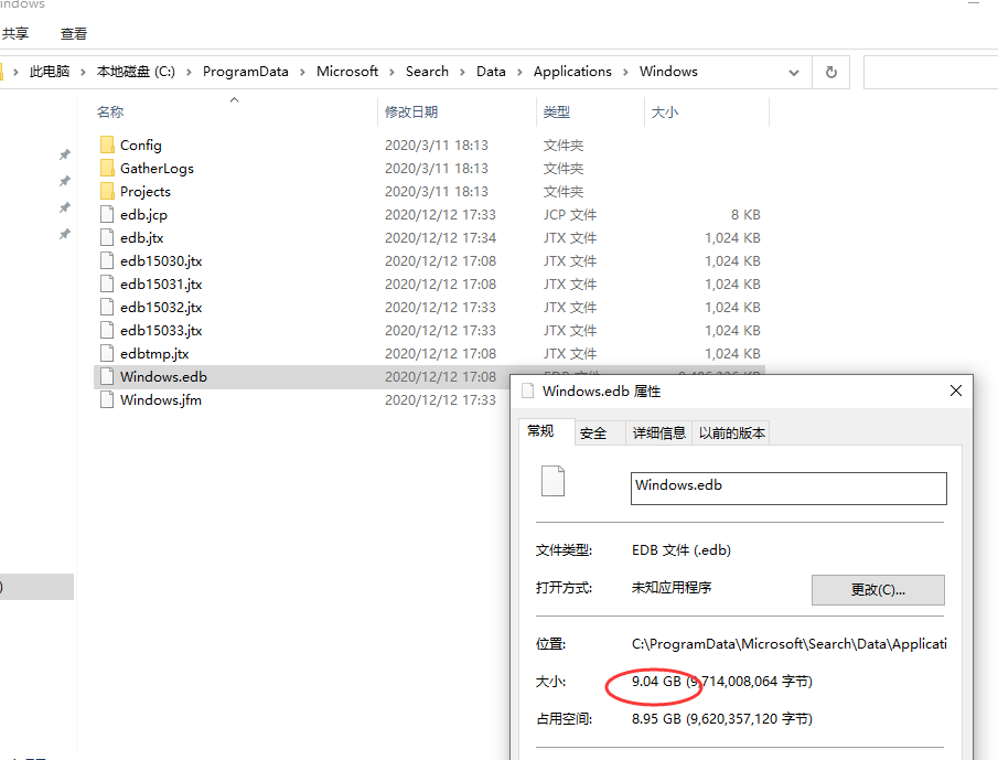 2. 删除 Windows.edb 文件,重启设备,等待索引自动重建,看一下是否还会占用大量的硬盘空间。