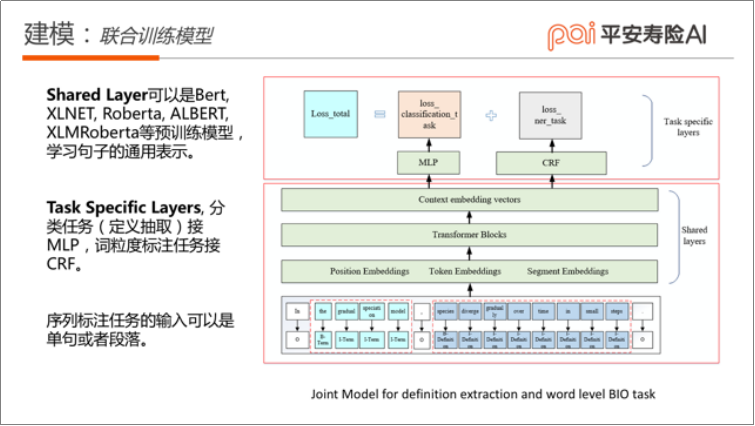我们在建模过程中采用hard parameter sharing的方式,定义抽取任务和序列标注任务共享一个Shared Layer用以学习句子单词通用的表达,然后不同的任务各自有自己的Task Specific Layer。