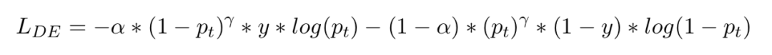 其中y是正确标签,是预测概率,我们在交叉熵的基础上增加了两个超参数,用来控制正负样本的权重和容易分类样本对整体损失贡献的权重。当样本为正的时候,标签y=1,损失函数第二项为0,alpha的大小控制着正样本的权重,alpha越大,把正样本分错产生的损失也越大。当一个正样本比较容易分类,预测值会非常接近1,当gamma越大的时候,容易分类样本贡献的损失也会越小,难分类样本贡献的损失会越大。