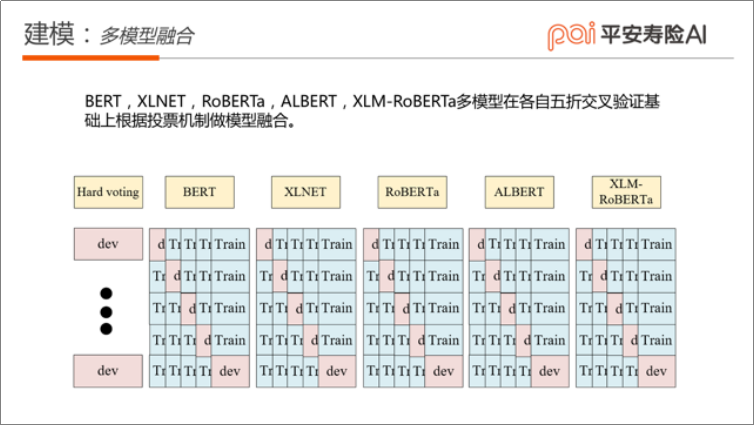 模型融合方面,我们采用五个预训练模型,五折交叉验证得到25个预测结果,然后采用hard voting的方式输出结果。其中XLM-Roberta是一个多语言训练模型,不需要传入额外的参数来指定当前输入的语言,模型可以通过input_id自己识别。