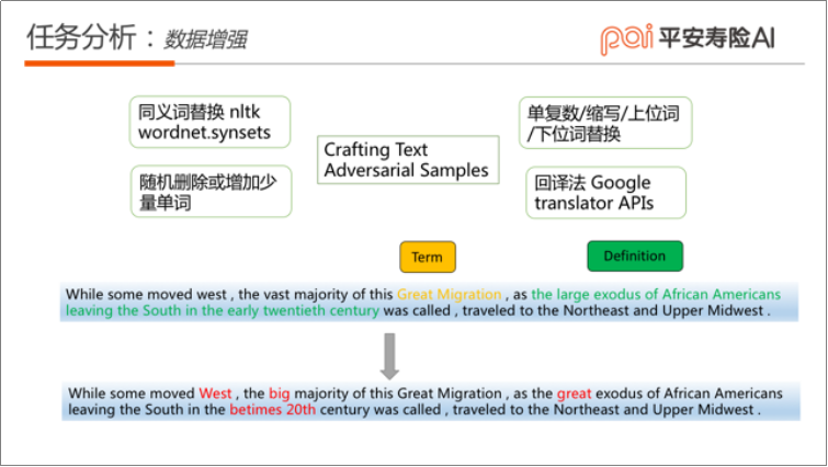 Subtask1可以用回译法,Subtask2只能用同义词替换保持句子单词数一致。下图中新句子里红色的单词是我们经过替换产生的。