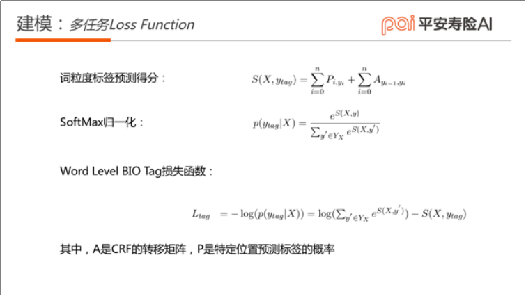 其中是第i个单词标签为的概率,是CRF里转移矩阵标签到的概率,序列标注的损失函数为最大路径得分除以所有路径得分再取log的负数。