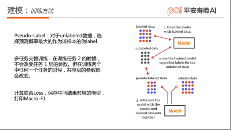 训练过程我们采用先训练Subtask2,再训练Subtask1,交替训练的方法。为解决训练数据不足,我们引入Pseudo-Label的技巧,但控制数量占比不超过有标签数据的十分之一。所谓Pseudo-Label,就是先用有标签数据训练一个模型,然后预测无标签数据,将概率较高的无标签数据打上伪标签,然后加入到训练数据中重新训练模型。