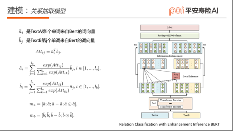 我们提出Enhancement Inference BERT模型对关系进行抽取 。模型输入两个实体,其中词向量取BERT最后四层hidden states的token embedding求平均。计算两个实体之间单词的Attention,然后通过TextB里词向量乘以一个归一化参数得到TextA的交互表达,同样的方式得到TextB的交互表达,最后通过差积,点积等操作,经过MLP,Softmax层输出关系label。