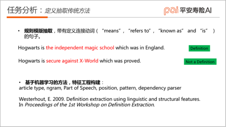 传统的定义抽取方法一般有规则模版方法和基于特征工程的机器学习方法。我们基于观察和统计,会发现很多定义都是有定义连接动词的,但是有定义连接动词的pattern匹配到的也未必是定义。另一方面,用规则模版,特征工程的方法并不能在保持准确率的同时具有良好的泛化性。