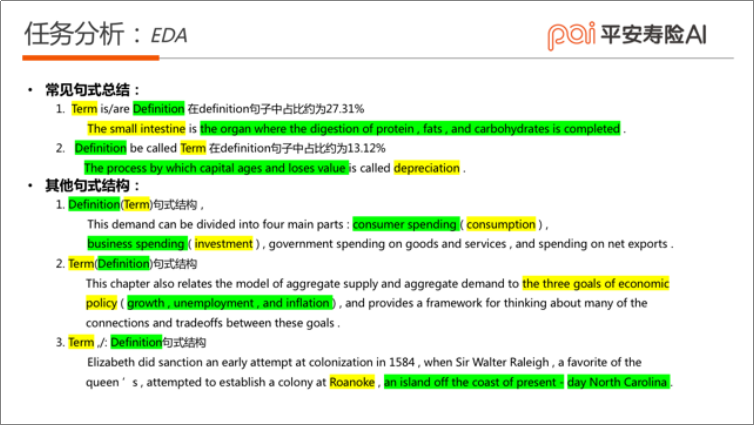 通过统计的方法,分析训练样本句式,各类标签占比。我们发现40%左右的常见定义句式都是Term be Definition和Definition be called Term这两种格式。