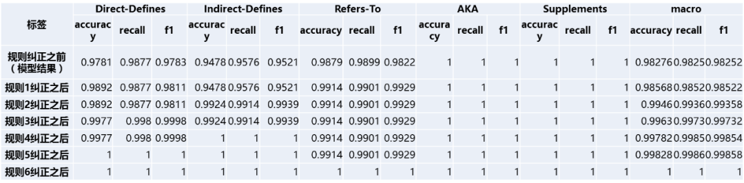 数据集存在多重定义以及长距离的指代关系,同一句话存在不同的实体标注和关系,当前讨论的实体在前文或后文中描述过,需要结合上下文信息才能预测出结果,这些都对准确识别提出了很高的要求。光靠模型很难学习到一句多义的情况。因此本次比赛采用实体规则对模型预测实体结果进行纠正,实验结果如下所示: