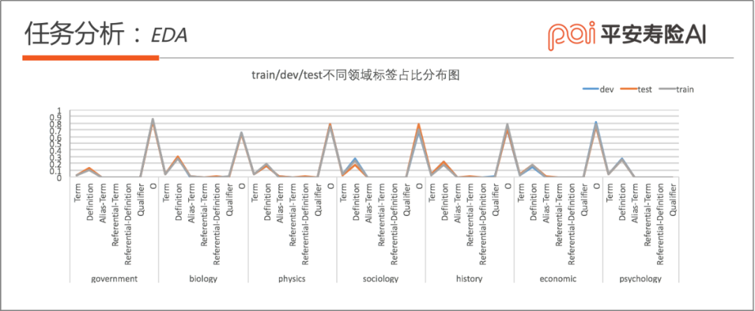 针对不同领域中不同标签占比进行统计分析发现,训练集/验证集/测试集在不同领域内的不同标签分布基本相同,同时统计每个领域内每个标签的占比可知,government领域中只有13.16%的数据带有标签,而biology领域中大约有33.79%的数据带有标签,远大于government。且biology领域内Qualifier标签远大于其他领域,占比约为0.73%,其他领域均小于0.2%。这些是符合常理认知的。