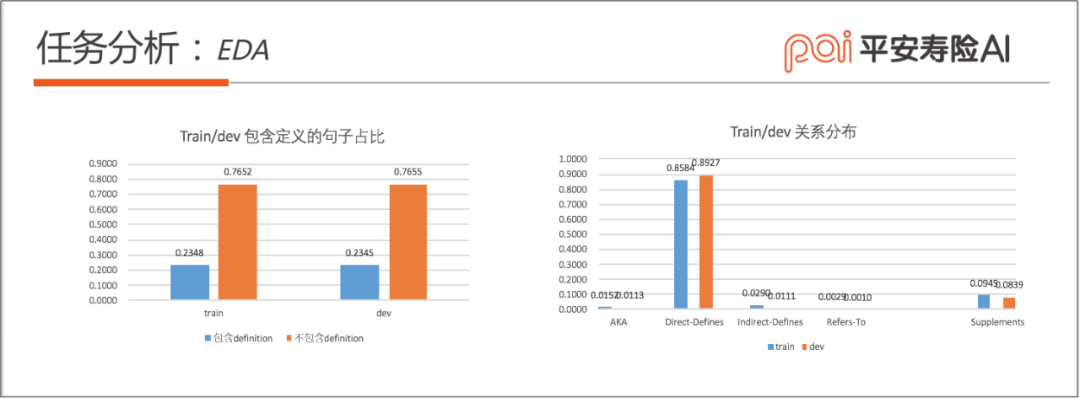 经过统计发现,包含定义的句子在所有句子里占比23%左右,也即任务1的正样本数量不到负样本的三分之一,这对我们后面模型损失函数的超参数设计有一定指导作用。关系标签里占比最多的是直接定义,占到85-89%的比例,其他的关系标签都属于小样本标签,这些都是后续数据增强重点关注类别。