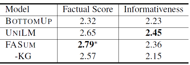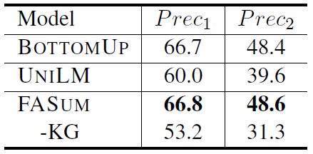 下表是计算结果。可以看到,FASUM在事实性知识匹配程度上显著优于基线模型,这说明在文本摘要中加入知识图谱的确可以保留事实性知识。