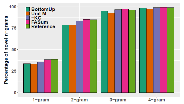 为了检验抽象式摘要生成文本的“抽象程度”——生成新的n-gram的比例,如下图所示。可以看到,FASUM在所有方法中,可以生成更加新颖的摘要,同时保留了事实性知识。