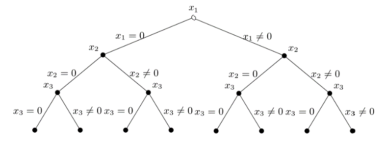 在求解子问题中,虽然子问题是 NP 难的,且没有快速的封闭解,但是我们依然可使用全局树形搜索获得全局最优点。注意,K 通常是一个很小的整数;例如,在我们的实验中,K=16。我们考虑简单的二次函数例子:。我们先系统地穷举下面的全二叉树,通过求解 个线性系统得到所有可能的局部极小值;然后我们选出使得目标值达到最小的那个作为最优解。