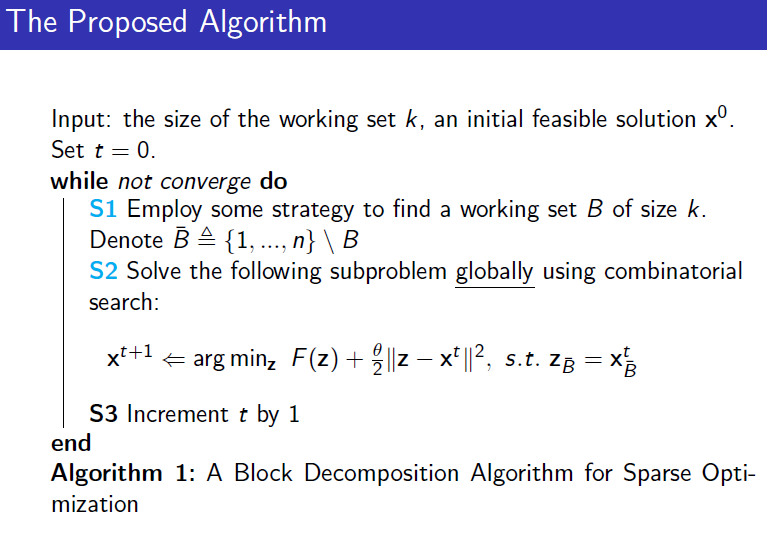 我们提出了一种求解稀疏优化问题的有效实用的方法。我们的方法利用了组合搜索和坐标下降的优点。我们的算法无论从理论上还是从实际上,都优于目前最具代表性的稀疏优化方法。我们的块分解算法已被扩展到解决稀疏广义特征值问题(见CVPR 2019)和二值优化问题。