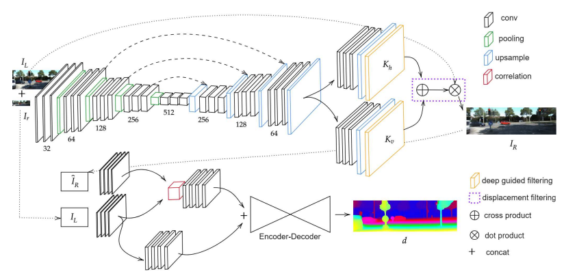 视差重构网络采用带有相关层的 DispNet [1] 结构,以高质量的左图和恢复的右图作为输入进行视差估计,最后采用多尺度的 L1 范式进行有监督回归学习。