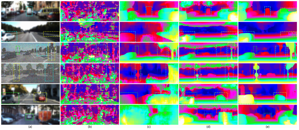 上图展示了这三种不平衡因素的视差估计结果,(a) 中从上至下是 10X 模糊,15X 模糊, 噪声, 噪声,10X 模糊 +0.5 整流误差,10X 模糊 +1.0 整流误差。(b)、(c)、(d) 分别是 PSMNet,CRL 以及 DORN 等 SOTA 方法,(e) 本文的方法。