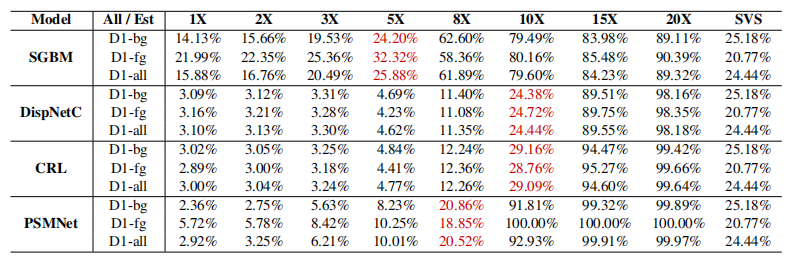 由上图可以看出随着模糊程度的加深,传统算法和深度学习算法的错误率都逐渐增大。以单目左图作为输入构建各个模型的 baseline,这里红色标注的是性能低于 baseline 的拐点。这说明对于多数方法:
