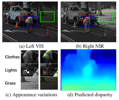 如上图所示,跨谱立体匹配指的是左图是可见光图像(a),右图是近似红外图像(b)。跨谱立体匹配的挑战在于两方面:一是可见光图像和红外图像在视觉外观上具有很大的差异,例如(c)中显示的衣服,灯光和草坪。二是跨谱图像的真实视差往往难以获取。本文采用 cycleGAN 以无监督学习的方式来实现不平衡视角的跨谱立体匹配。