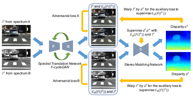 类似采用 GAN 来实现两个领域数据变换的方法还有今年 CVPR 提出的 StereoGAN,它采用 cycleGAN 来解决域自适应立体匹配,大家有兴趣可以对照着阅读。