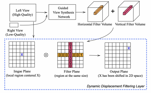 上图展示了引导视角合成的原理。我们可以通过引导视角合成网络来学习左右图在边缘轮廓上的匹配情况,从而生成一个水平方向的滤波器 和一个竖直方向的滤波器 ,大小分别是 和 ,用来表示右图相对于左图的偏移。