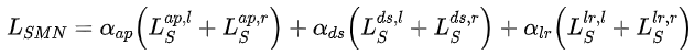 跨谱立体匹配网络 SMN 采用经典的 DispNet,同时估计以左右图为参考图像的视差 和 ,其采用 [2] 中介绍的三种无监督损失函数,即外观匹配损失(appearance matching,ap),视差平滑损失(disparity smoothness,ds)和左右一致性损失(left-right consistency,lr)。