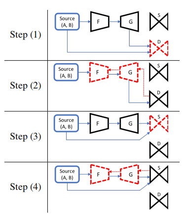 为了训练整个网络,作者采用的是分步迭代优化的策略,具体的步骤如上图所示。第 (1) 步,通过判别器损失 来训练判别器 D,从而使得判别器能够鉴别真假图像。第 (2) 步,通过生成器损失训练 F 和 G 网络。
