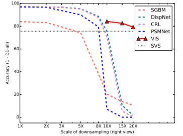 那么现在的一个问题是当右图模糊到什么程度时,立体匹配算法会失效?作者首先进行了一个实验,将右图先下采样多倍再上采样恢复,以模糊图像。下图是对经典的传统方法和深度学习方法进行评测的结果。