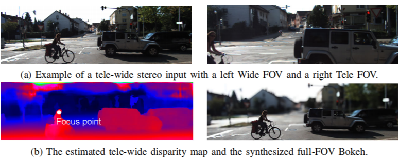 采用长短焦立体匹配是为了获得更好的背景虚化效果(Bokeh)。以往的方法将左图 WFOV 裁剪成和右图 TFOV 一样小的视角,那么只能估计 TFOV 区域大小的视差图,得到的背景虚化图区域有限。而如果能得到 WFOV 区域大小的视差图,则可以获得全景背景虚化效果,如上图(b)。