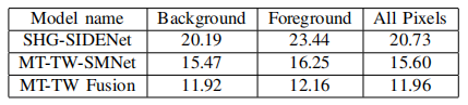 相似的结论能够在上表的 SceneFlow 测试集上得到,其中 MT-TW-SMNet 相比于 TW-SMNet(W) 和 SHG-SIDENet 在中心区域和周围区域都有所提升,取得了最佳的效果。