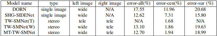 上表是在 KITTI 2015 上的实验结果,SHG-SIDENet 的整体错误率最低,但是在中心区域(TFOV)性能较差。TW-SMNet 在中心区域的性能很好,TW-SMNet (T) 不能估计周围像素的视差,TW-SMNet (W) 在周围像素估计上不如 SHG-SIDENet。MT-TW-SMNet 相比于 TW-SMNet (W) 提升了周围像素和总体像素的准确率,但是中心区域要差一些。