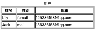 用户信息表 姓名 性别 邮箱 Lily femail 1252361581@qq.com Jack mail 1363361581@qq.com