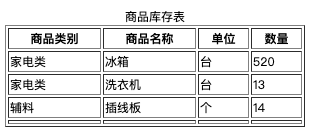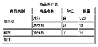 商品库存表 商品类别 商品名称 单位 数量 家电类 冰箱 台 520 洗衣机 台 13 辅料 插线板 个 14 备注: