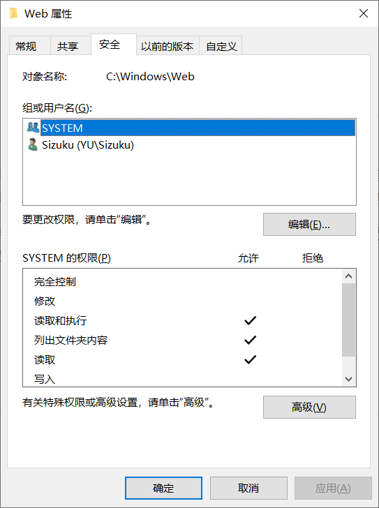 可以看到形如这个列表的东西,这台电脑被允许访问这个文件夹的所有用户,当然了,我这里是已经改好的版本,大家看到的可能会有很多奇奇怪怪的东西,但唯独没有最重要的那一个:自己的本地账户。并且想要修改这个文件夹还要得到该文件夹拥有者给予的权限。什么??电脑都是我的文件夹难道还不是我的?还真不是,点开高级选项,我们就可以看到该文件夹的所有者是谁了: