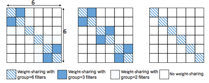 如图所示,在一个输入 6 通道输出 6 通道的卷机层中,可以选取的 group 数目为 1,2,3,6。group=1 时为全卷积,训练参数为存储的所有 weights。当 group=6 时为 depth-wise 卷积,训练参数为对角线上的所选 weights。为了方便直观化表示,下图的每一个 cell 代表了一个 3x3 的卷积核。