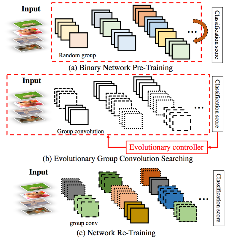 为了取得压缩率与网络精度之间的权衡,我们认为,每一层卷积对应的feature的抽象化程度不同,因此,对于表达能力的要求也不一样。基于这个假设,我们提出用网络自动搜索(NAS)的方法搜索每一层的组卷积的最优group数,作为depth-wise 卷积和全卷积之间的trade-off。