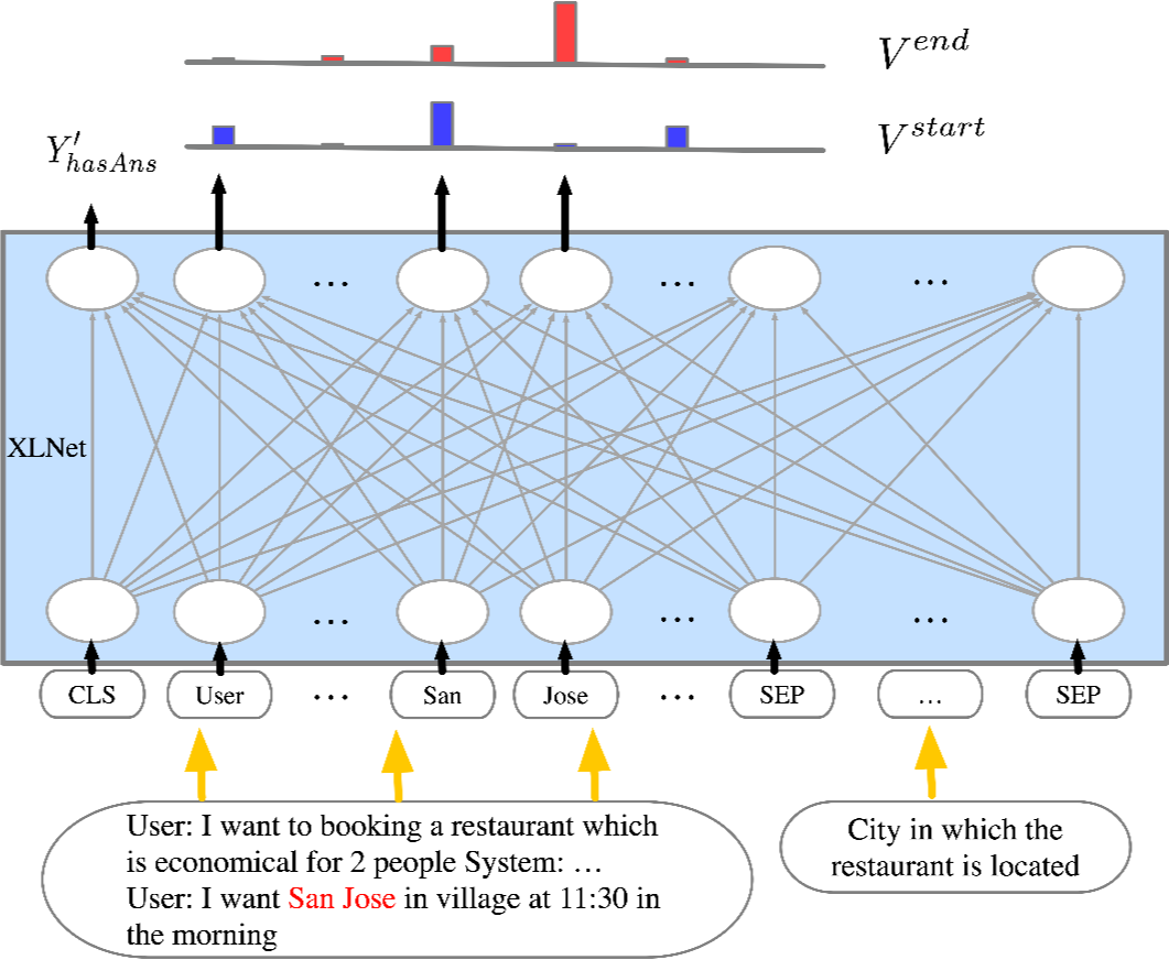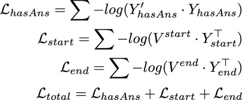 模型基于 XLNet 得到的深度语义表示,计算槽值存在指示器和起止位置向量。假设真实的槽值存在性为 ,真实答案片段的起止位置向量为为 和 。使用两个部分中三个 Loss 共同指导模型训练: