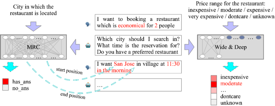 对于可枚举槽位,因为它是使用了原文的一个对话片段来作为槽值,并且在数据中能够直接获取当前槽值在原文中的位置信息,我们使用了阅读理解的模型(MRC-DST)来解决这类问题。