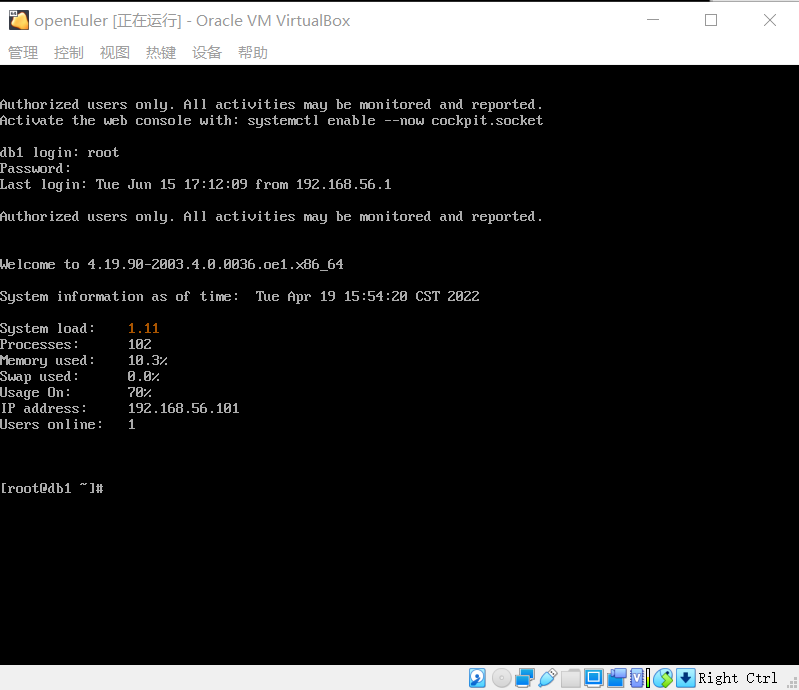 按下enter键进入,并输入root和密码(openGauss@123) 这里要注意的是虚拟机独立控制键盘和鼠标,所以一定要检查自己的数字键盘是否开启,为避免该种错误,可以用大键盘上的f1等