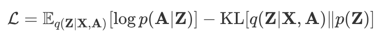 VGAE 依然希望重构出的图和原始的图尽可能相似,除此之外,还希望 计算出的分布与标准高斯尽可能相似。因此损失函数由交叉熵和 KL 散度两部分构成: