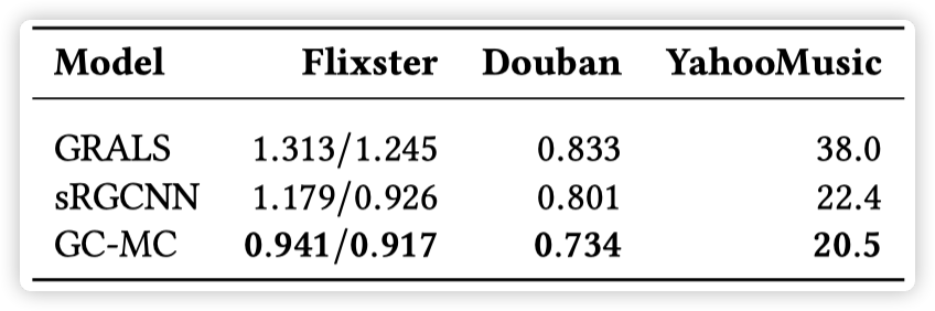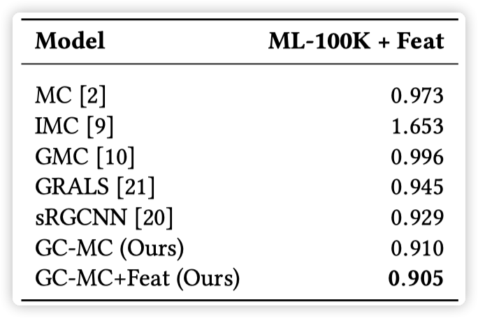 实验结果表明,在有 side information 时,GCMC 的效果好于其他方法,尤其是当 side information 以 graph 的形式存在时,GCMC 的效果优势更加明显。而当没有 side information 时,GCMC 也表现出了 competitive results。