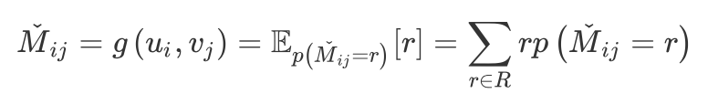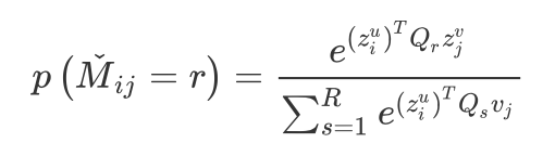 在得到 users 和 items 的 embeddings 后,通过下式来预测 user i 对 item j 的评分属于 r 的概率: