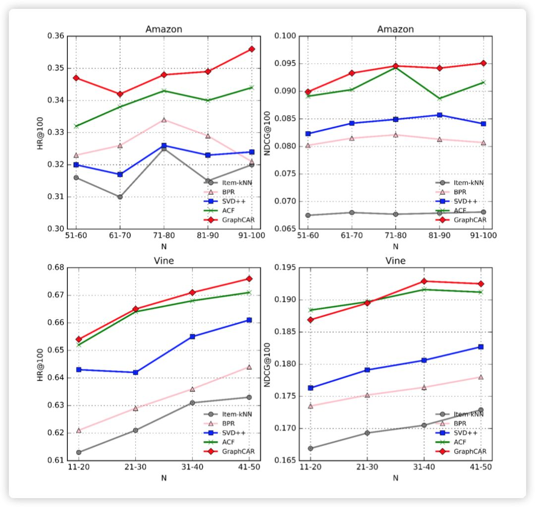 从图中可以看出,GraphCAR 对于交互数量较少的 users 的效果优势并不明显,而当 users 的交互数量增多时,效果优势开始慢慢明显起来。