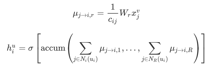 是参数矩阵, 是归一化因子,可以是 或者 ,其中 表示 user i 的邻居数。accum 也有两种选择:stack 或者 sum。 表示激活函数,可以是 sigmoid、ReLU 等。