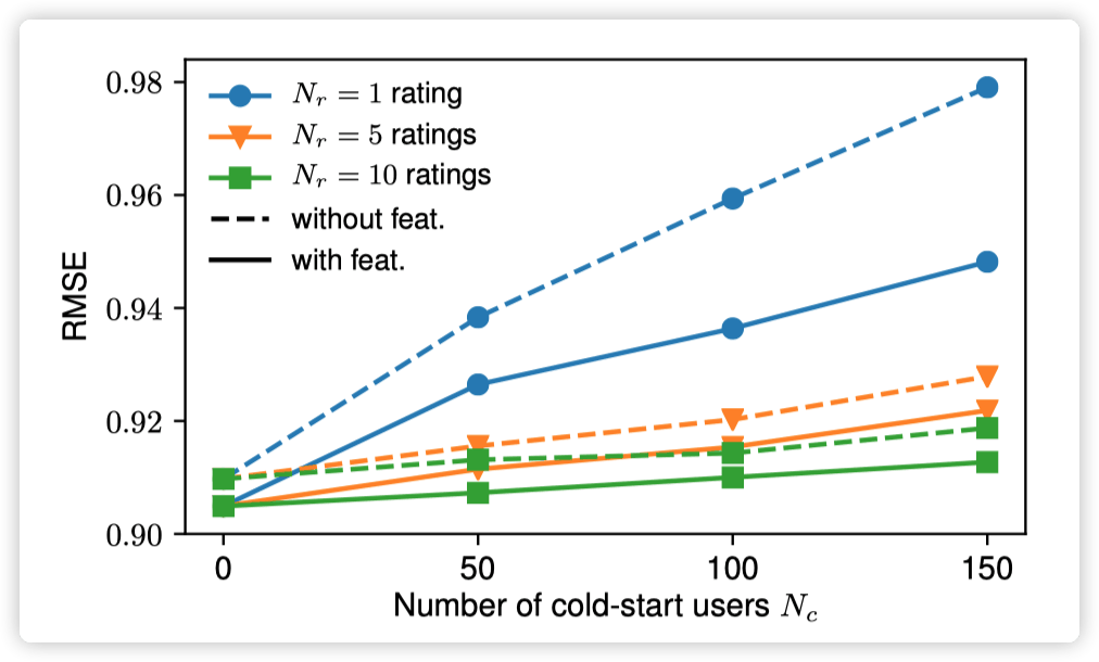作者还分析了 side information 对冷启动的影响,文中以 ml-100k 为例,将一些用户的评分数量人为减少,然后对比了 GCMC 分别在使用和不使用 side information 时的效果。